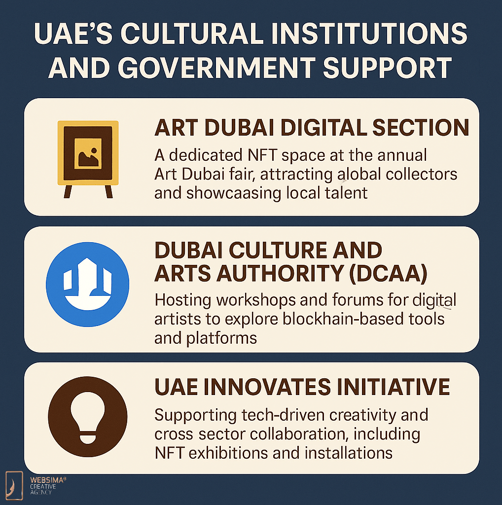 - Dubai Culture and Arts Authority (DCAA): Hosting workshops and forums for digital artists to explore blockchain-based tools and platforms.
