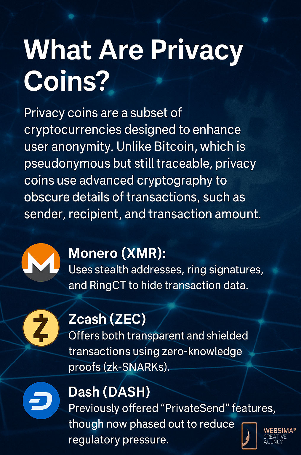 Privacy coins are a subset of cryptocurrencies designed to enhance user anonymity. Unlike Bitcoin, which is pseudonymous but still traceable, privacy coins use advanced cryptography to obscure details of transactions, such as sender, recipient, and transaction amount.
