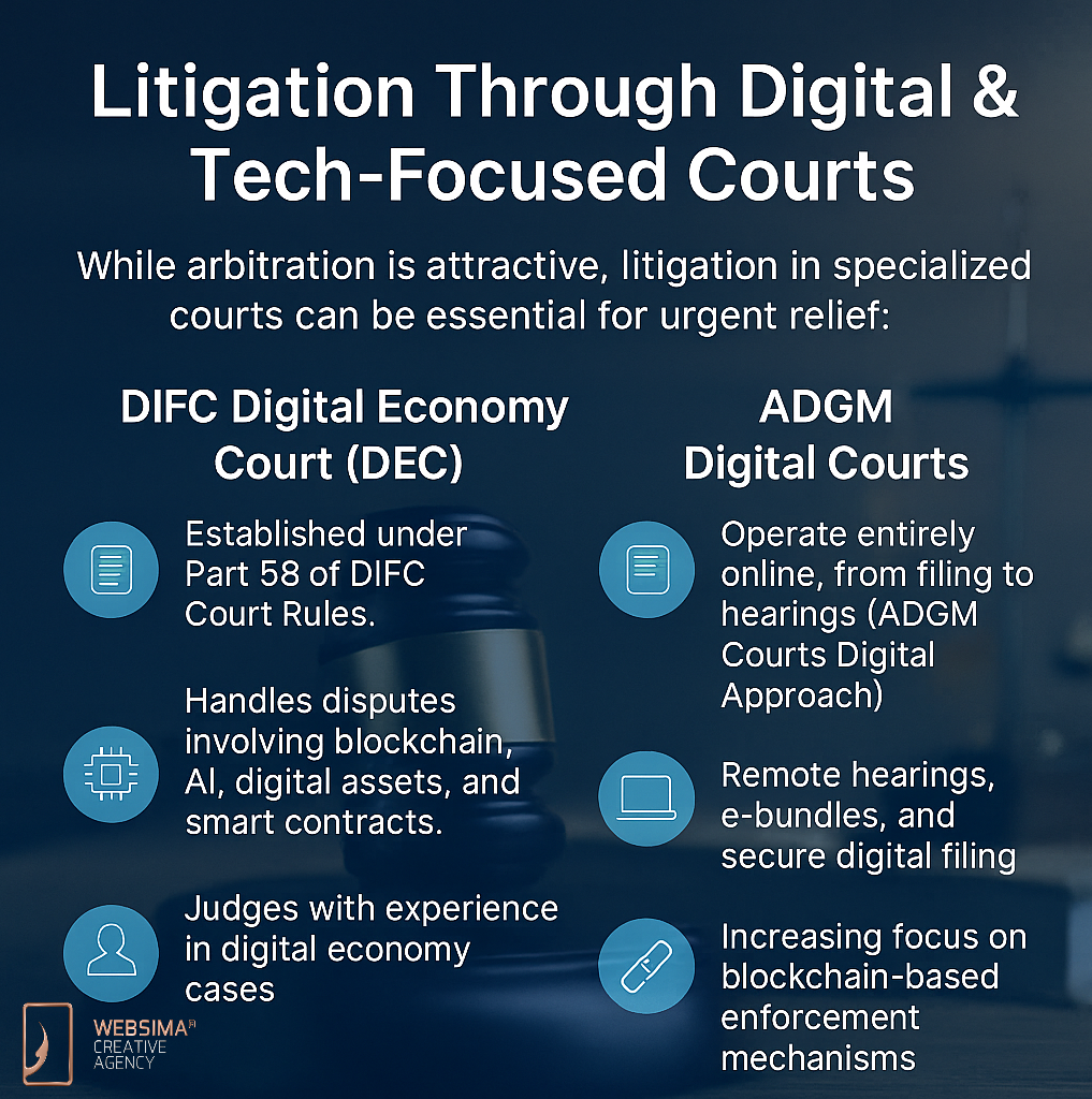 This is where Dubai’s two common law jurisdictions—the Dubai International Financial Centre (DIFC) and the Abu Dhabi Global Market (ADGM)—play a decisive role. Both provide internationally recognized legal systems, arbitration regimes, and specialized courts built to handle digital disputes.