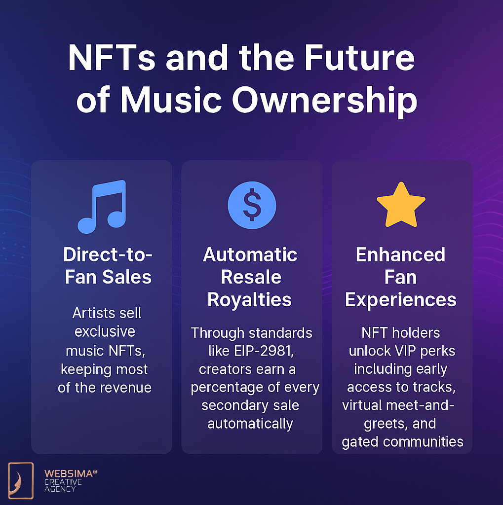 NFTs enable fans to own digital collectibles, access exclusive experiences, and allow artists to earn perpetual resale royalties.